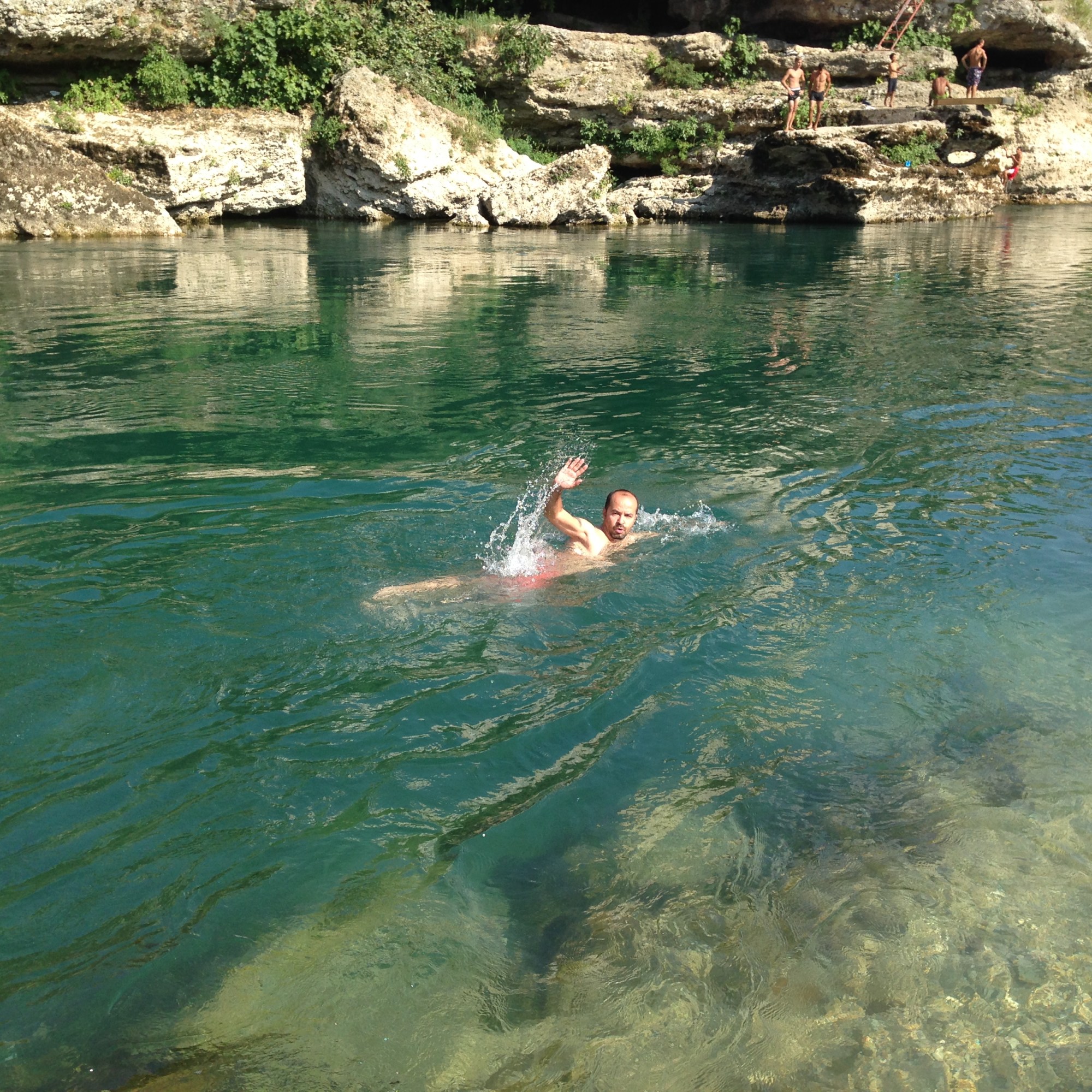 Hem soğuk suda yüzme hem tarihi ambiyans dolayısıyla daha fazla endorfin ve serotonin hormonu salgılıyorum muhtemelen. İyi ki hayattayım iyi ki geziyorum dediğim anlardan birini yaşıyorum. Sudan çıkıp bir süre güneşlenip kuruduktan sonra, hatıra fotoğrafları çekiyorum. Bulunduğum noktanın bir diğer güzel yanı da köprüden atlayanları bu noktadan çok daha net görebiliyorsunuz.